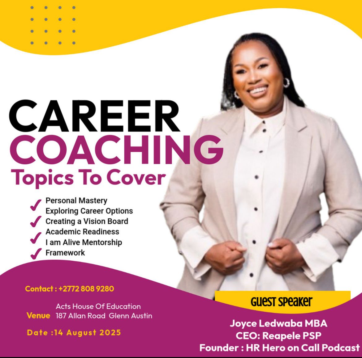 “We share powerful career moments with industry leaders, trailblazers and inspiring professionals who have risen to the top of their fields, they have built meaningful, successful careers and now they want to help you do the same. Whether you are just starting out or ready to level up, this is your moment, your dream career is calling.”